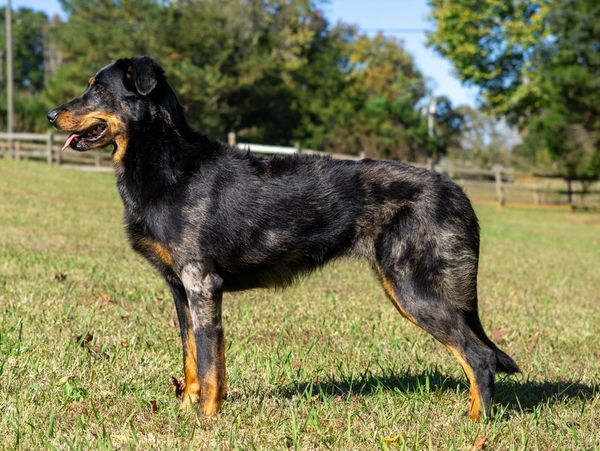 Verity is our most recent import from France, coming from a breeder focused on sound temperament and correct Beauceron type. She brings an easy-going, social, and unabashedly playful personality, far more extroverted than the breed’s typically serious reputation. Verity believes the world is full of friends, not strangers, and approaches life with humor and enthusiasm.